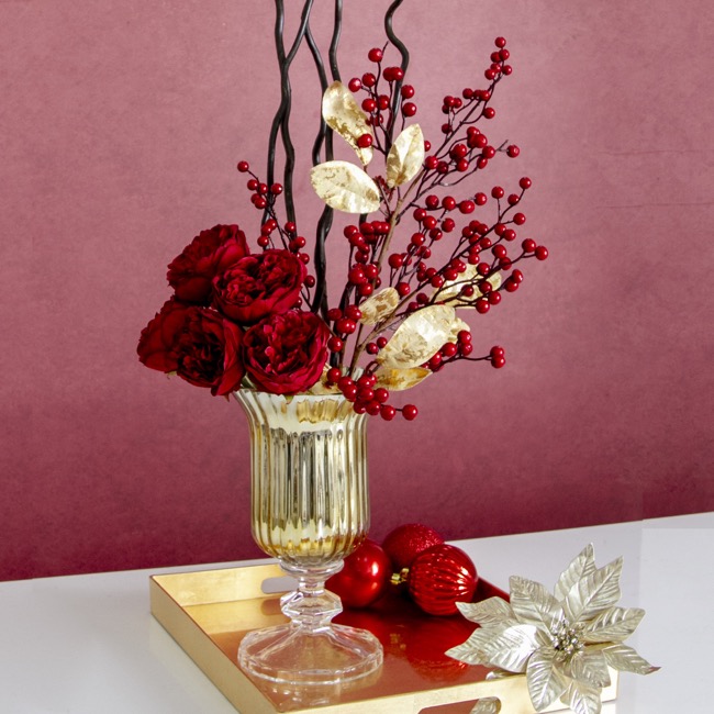This arrangement has the golden touch. The Gold glass vase is the appropriate vessel for this flower arrangement.
