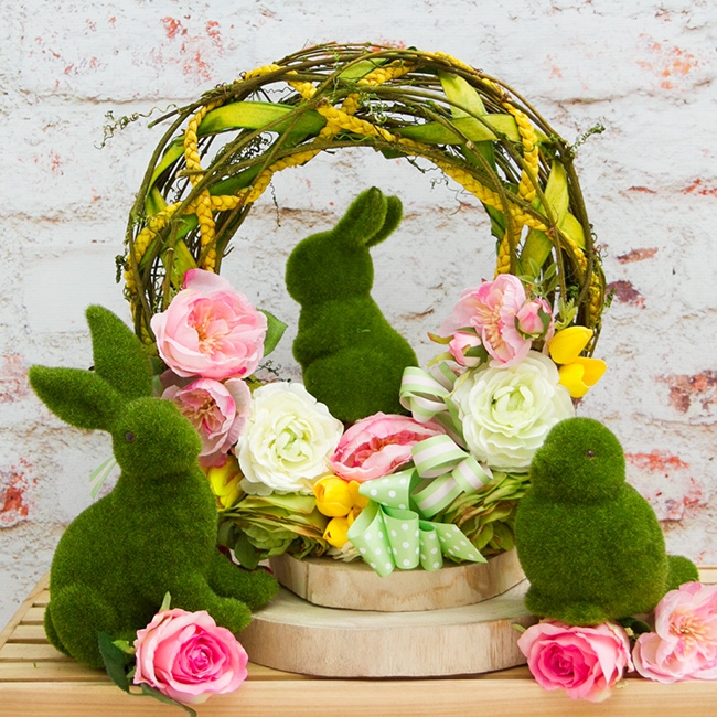 For a chic display all year round combine natural wreaths and flowers and add a seasonal decoration like rabbits to reflect the celebrations for the season.