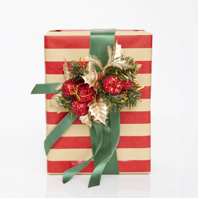 Glits up a Christmas present with a sparkly Christmas pick. Add greens and reds together to create a traditional theme.