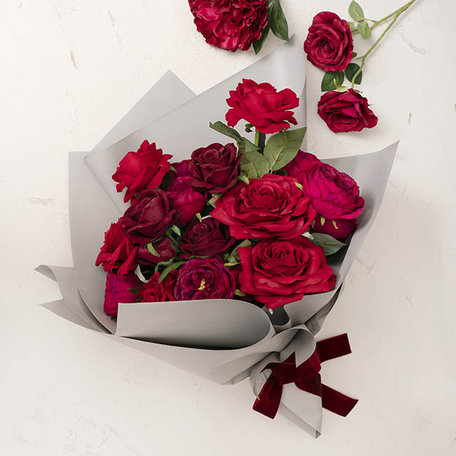 A modern, moody bouquet style pairing cool grey wrap with a deep velvet ribbon. Perfect for florists looking to create a Valentine’s look that’s elegant, understated, and effortlessly premium.