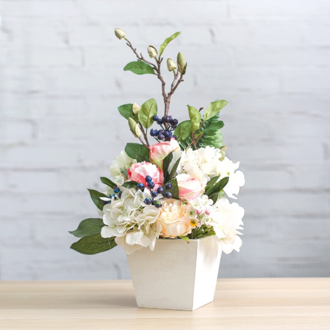 Have a magnolia bud stem as the centrepoint of this arrangement, and complement that centrepoint with an array of different artificial flowers.