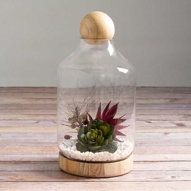 New range of of cloches with a wooden base finish ideal to be used as display only or filling it with simple greenery.
